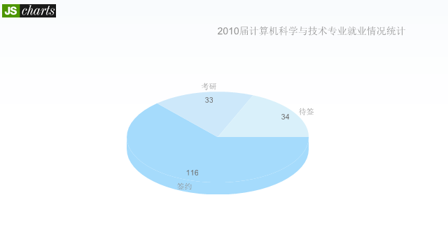 2010年,计算机科学与技术专业毕业生总人数191人。其中考研33人,考研占总人数17.28%;签约116人,签约占总人数60.73%;灵活就业8人,灵活就业占总人数4.19%;待签34人。合计就业人数157人,就业率82.20%。