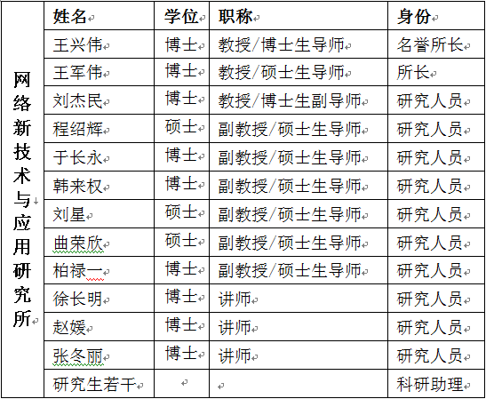 东北大学秦皇岛秦皇岛分校网络新技术与应用研究所成立于2011年,现有科技人员7名,其中教授2名、副教授1名、讲师4名;其中具有博士学位教师7名,7名研究生导师。