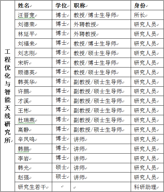东北大学工程优化与智能天线(EOSA)研究所坐落于风景秀丽的海滨城市秦皇岛。研究所自创建以来,在汪晋宽教授的带领下不断发展与壮大,研究方向具有多样性且紧跟国际学术前沿领域。目前研究所的主要研究方向有:智能电网、移动通信关键技术、认知雷达、制导与智能控制、无线传感器网络、人脸识别、认知无线电网络、阵列信号处理等;研究所现设有智能天线研究室、传感器网络与测向定位实验室、智能视频监控实验室、信号处理研究室,工程优化与智能控制研究室。现有博士生导师3人,海外学者3人、教授7人,副教授15人,博士研究生19人,硕士研究生52人。学术梯队合理,已形成了一种独立研究、相互协作、定期讨论和各攻所专的学术风气,具有良好的科学研究氛围。